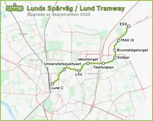 The Lund tramway (Swedish: Lunds spårväg) consists of a single double-track 5.5 km (3.4 mi) 9-stop tram line in Lund, Sweden.[1] It connects Lund Central Station with the hospital, Lund University (LTH), Ideon Science Park, the new upcoming district of Brunnshög,[1] the MAX IV synchrotron light source, and the European Spallation Source[2] with a 15-minute tram ride. It is the fourth modern city tramway in Sweden and is operated by Skånetrafiken,[2] which also operates the city and regional busses and trains.