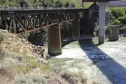 The Lytton CNR Thompson Bridge is a deck truss bridge carrying the Canadian National Railway tracks from across the Thompson River at Lytton, British Columbia, approximately 200 meters (660 ft) upstream of where the Thompson River merges into the Fraser River. It is of a similar design and should not be confused with the Lytton CNR Fraser Bridge located approximately 1.4 kilometers (0.87 mi) south. It consists of 3 deck Pratt truss spans which are supported on four concrete piers. The centre two piers are in the river while the outer two are shorter and above the waterline.[1] British Columbia Highway 12 crosses the Thompson River mostly parallel to, and slightly downstream of this bridge. The south end of the road bridge is directly above the south end of the railroad bridge.