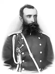 Grum-Grshimailo was born in the Mogilev province to Efim Grigoryevich Grum-Grzhimailo (1824-1870), a sugar and tobacco producer, and his wife Margarita Mikhailovna née Kornilovich. Like his brothers Vladimir and Grigory, Mikhail went to the 3rd St. Petersburg military gymnasium and joined military service in 1878 graduating in 1881 from the Mikhailovsky Artillery School. From 1887 he joined expeditions into the Pamirs[1] along with his brother Grigory. He described his travels and was elected member of the Russian Geographical Society, receiving a Przhevalsky medal in 1891. He taught military geography from 1892 to 1898. He became a commander of the 41st artillery brigade in 1907 and retired the next year. He was however back to service during World War I. He helped develop saddles for the carriage of guns and heavy equipment. He also designed a goniometer for artillery users and camping gear for soldiers. He also developed telephone standards for use in the army. In 1920 he was arrested during the Russian Civil War and in 1921 he was sent to Butyrka prison where he died.[2]