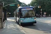 The westbound bus then continues on 79th Street to Fifth Avenue. After this, the bus keeps straight and merges onto the 79th Street Transverse. It then leaves the Transverse on the intersection of Central Park West and 81st Street and continues along 81st Street to Columbus Avenue and then turns left onto it and then turns right onto 79th Street 2 blocks later. It continues along 79th Street to its westbound terminus at Riverside Drive.[1][5][6]