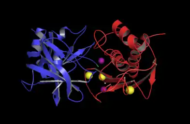 TIMP-1 (blue) in complex with MMP-3 (red). Note the Cys1 (green) TIMP-1 chelating to the catalytic zinc (purple). Calcium ions (yellow) are also shown. Based on the PyMOL rendering of PDB 1UEA. For simplicity, the other MMP-3 monomer complexed with its respective TIMP-1 is not shown.
