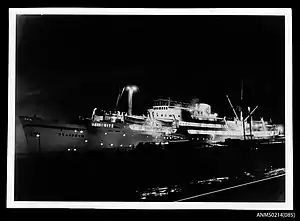Skaubryn's main service was from European ports to Sydney, Australia, though she also made a number of sailings to Canada. In 1953 she carried French Foreign Legion troops to fight in Indochina. One of them who escaped the ship, Ensio Tiira, later wrote a book about his subsequent experience on a raft for 32 days.[2] She was chartered several times, once by the French Government in the mid-1950s to bring troops back from Vietnam. Skaubryn was one of the last vessels to pass through the Suez Canal immediately before its closure due to the Suez Crisis of 1956. In late September 1956 the Dutch Government used her for a single voyage from Rotterdam to Halifax and New York. That same year and in early 1957, she was chartered by the British Government to transport troops from Singapore to the UK. The Greek Line chartered her later in 1957 for four round trips from Europe and the UK to Quebec, after which she returned on the Australian emigrant service again.[1]