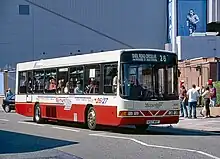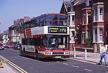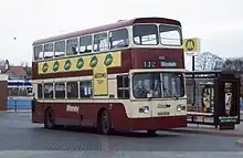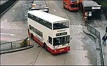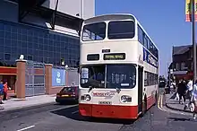 Merseymaid and Silver Service were brand names for cross-river double-deck Merseybus services between Liverpool and the Wirral via the Mersey Tunnels. Initially, a Willowbrook bodied Leyland Atlantean and five Alexander R-Type Leyland Olympians were refurbished at the Edge Lane works with soft trim, internal address systems and coach seats in November 1992, before then operating on routes 410 and 411 from Eastham to Liverpool. To attract passengers, the drivers of 'Silver Service' buses were given special customer care training, while MTL advertised a weekly ticket lower than four days' tunnel toll fees.[23] At the end of 1995, this operation was augmented with a batch of 30 similar specification Northern Counties Palatine II bodied Volvo Olympians, which were also used on other cross-river services.[7] Silver Service branding was dropped inconspicuously during 1998.