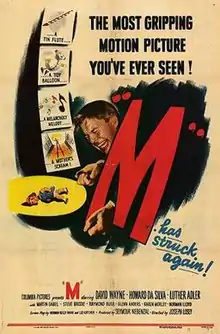 M is a 1951 American film noir directed by Joseph Losey. It is a remake of Fritz Lang's 1931 German film of the same title about a child murderer. This version shifts the location of action from Berlin to Los Angeles and changes the killer's name from Hans Beckert to Martin W. Harrow. Both versions of M were produced by Seymour Nebenzal, whose son, Harold, was associate producer of the 1951 version.[1]