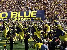 The banner, reading "Go Blue: M Club Supports You", is raised at midfield before every Michigan home game. Michigan players run from the Michigan Stadium tunnel as the Michigan Marching Band plays "The Victors". As the players approach the banner, they leap to touch it.[1][2]
