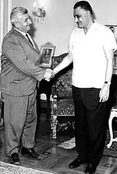 Maarouf Saad (Arabic: معروف سعد; 1910[2] or 1914[1]–6 March 1975) was a Lebanese politician and activist. He served as Sidon's representative in the Parliament of Lebanon between 1957 and 1972. He founded the Popular Nasserite Organization in 1973. Saad was known to have a charismatic and populist relationship with the residents of Sidon and the adjacent Palestinian refugee camps, according to historian Samir Khalaf.[3] Nonetheless, tensions developed between Saad and the Palestine Liberation Organization in the 1970s as they competed for influence in Sidon. Saad's assassination sparked the Lebanese Civil War, and he is considered by many historians the conflict's first casualty.[4][5]