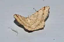 The head is reddish brown in color. A particular characteristic of markings are the 3 or 4 dark brown marks where the antemedial, medial, and postmedial lines meet costa (forewing leading edge) and by a larger, subrectangular spot where subterminal band meets costa. Another segment of subterminal band usually persists as a smaller dark spot between M3 and CuA1.[2][3] It is very similar looking to Psamatodes abydata which lacks the dark brown costa marks. The ground color (overall) of the wings ranges from light milky tan to darker gray-brown.