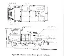 The design was a militarized version of a civilian Cab Over Engine (COE) model, partly redesigned to make it 4WD. A Mack engine and transmission were matched with a Timken 2-speed transfer case and double-reduction axles. The EN532 engine was a 532 cu in (8.7 L) L-head inline 6 cylinder gasoline engine developing 136 hp (101 kW) at 2500 rpm. The 5-speed transmission drove the separate transfer case.[3]