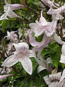 Growing to 1.5 m (4.9 ft) tall and broad, it is an evergreen shrub with glossy green leaves, and trumpet-shaped pale lilac flowers veined in purple. The plant is not hardy below 10 °C (50 °F), so in temperate zones requires protection during the winter months. However, it may be placed outside in a sheltered spot in summer. It requires an alkaline or neutral soil.[3]