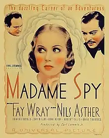 Madame Spy is a 1934 American adventure film directed by Karl Freund and starring Fay Wray, Oscar Apfel, Edward Arnold and Nils Asther.[1] The film was produced and distributed by Universal Pictures.[2][3][4] It is a remake of the 1932 film Under False Flag which was produced by Deutsche Universal, the German subsidiary of the studio, and was itself based on a novel of the same title by Max W. Kimmich.[5]