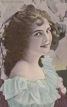 She appeared on the bill at the opening of the London Coliseum Theatre of Varieties on 24 December 1904 on a variety programme in which she sang "Goodbye, Little Girl", "My Irish Molly O" and a number of other popular hits of the time.[12] Her other roles during this period include the title role in Em'ly (an adaptation of David Copperfield) at the Adelphi Theatre (1903),[13] Jill opposite Dan Leno and Herbert Campbell in the pantomime Mother Goose at the Theatre Royal Drury Lane (1902)[14][15] and appearances in Erminie at the Casino Theatre in New York (1903); Wang (1903) with the DeWolf Hopper Opera Company;[16] Sergeant Brue at the Prince of Wales Theatre in London, (1904); Elsie in 18 matinee performances of the piratical tale Noah's Ark at the Waldorf Theatre in London (1906) in which "Miss Madge Lessing laughed and danced and sang very charmingly, and seemed to enjoy everything quite as much as the children on the stage or in the front of the house";[17][18] The Prince of Pilsen (1907/8) at the Olympia Theatre in Paris, and Halloh! (1909) at the Berlin Metropol. Lessing was also the dance partner to Will Bishop in the Berlin Metropol revue Chauffeur-ins Metropol in 1912. While in Berlin she appeared in a number of films for director Max Mack including as Fritzl Lustig in The Blue Mouse (1913), Lolotte in Where Is Coletti? (1913)[19] and Gusti in A World Without Men (1914). She remained at the Metropol for four years until the outbreak of World War I forced her to return to England where she played in the London production of Sleeping Partners and the leading role in The Girl from Ciro's.