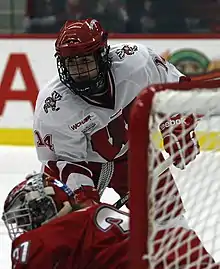 During her tenure at Wisconsin, the team would also win one WCHA Championship, and two WCHA league championships.[9] Packer earned rookie honours and player-of-the-week honors during her tenure. During her final season, Packer was an alternate captain for her college team.[10][7] Packer played 146 games for Wisconsin, scoring 46 goals and 58 assists for a total of 104 points.[11] After her fourth year, Packer retained a connection to hockey, as the radio announcer for Badgers games during the 2014–15 season.[12]