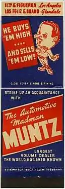 Muntz rejected the then-common opinion that used car salesmen should project a staid image.[1] He realized the possibilities of generating publicity with odd stunts, and developed a "Madman" persona as a result.[10] His flamboyant billboards and oddball television and radio commercials soon made him famous. In his used auto commercials, he marketed one model as the "daily special"; Muntz claimed that if the car did not sell that day, he would smash it to pieces on camera with a sledgehammer.[11] Another notorious Muntz used-car TV pitch was "I buy 'em retail and sell 'em wholesale ... it's more fun that way!"[4] His commercials generated so much publicity that comedians such as Bob Hope, Jack Benny, and Steve Allen often tried to outdo each other during television appearances by telling "Madman" Muntz jokes.[1] University of Southern California fans would spell out Muntz's name during halftime as a prank.[10]