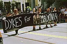 During a Nightline interview in early 1990s, after being asked for her sexual irresponsibility, Madonna responded: "Why are images of degradation and violence toward women okay, almost mainstream, yet images of two women or two men kissing taboo?".[90] Lynne Layton, a Harvard University lecturer in women's studies made a reference for her statement agreeing with it.[90] However, in 1995, Los Angeles Times reacted skeptical with The Advocate naming Madonna "Sissy of the Year", as she presented to her audience "ambiguous" and "mystical" about many things, including sexuality. But they agree: "Two things she is very firm about is her support for the lesbian and gay community and doing something about HIV/AIDS".[91]