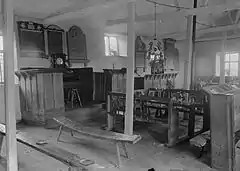 The ceiling is barrel-vaulted,[14] and divided into six bays.[15] Much of the 18th-century furniture is still present in the chapel.[8] The interior is dominated by the pulpit, that stands in the middle of the long wall opposite the entrance. Behind it is a window, which both provides light for the preacher, and surrounds him with a "halo".[15] In front of the pulpit is a large table, two benches (which are dated 1728), and another table which is used for communion.[16] The communion table is dated 1727. Also in the church are box pews, and some simple backless benches. On the walls are memorials dating from the early 19th century that include inscriptions in Latin.[8]