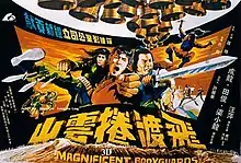 Magnificent Bodyguards is a 1978 Hong Kong martial arts action film starring Jackie Chan and directed by Lo Wei.[3] Chan, along with Luk Chuen also worked as stunt coordinators. This film was well received in Hong Kong, but Chan himself doesn't like it. He puts it down to Lo Wei not giving him any creative freedom. This was the first film in Hong Kong to be filmed using 3-D technology, and it features music from Star Wars.[3]