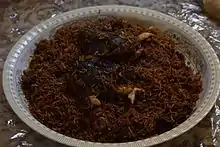 Mahmous (Arabic: محموص) an Arabic rice dish popular in Qatif and al-Hasa regions in Saudi Arabia, and Bahrain regions. Its primary ingredients are rice and onion. The dish may have originated before the rise of oil in Saudi Arabia when the people in Qatif were too poor to offer such dish with chicken, fish or meat[1] so onion was used instead. And because of its black color and it can be prepared with relative ease with inexpensive ingredients, it is widely offered during Ashura to the audience to indicate a climate of grief during that period.[2]