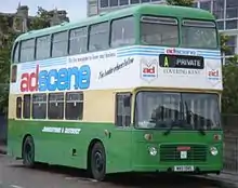 Maidstone & District became part of the National Bus Company (NBC) on 1 January 1969. The company purchased several batches of Leyland Leopards for both bus and coach work. An unusual order was for a fleet of 30 two-door Marshall single deck vehicles based on Daimler Fleetline 33 ft. chassis for one person operation in the Medway Towns. In 1972 these were exchanged with similar age double deckers Fleetlines from Northern General Transport. NBC introduced standard liveries in 1972 and the traditional dark green and cream livery gave way to NBC leaf green.