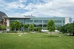 The 1991 building was designed with a marble exterior and a round-arched entrance on the north side of the west facade, echoing the design of the Carnegie building.[2] When the building was renovated in 2015–2016, most of the marble was replaced with glass curtain walls, and the round-arched entrance was replaced.[21] The 1991 construction and 2015 renovations won the Columbus Landmarks Foundation's James B. Recchie Design Award; the latter project beat out the National Veterans Memorial and Museum and the Michael B. Coleman Government Center in 2019.[25]