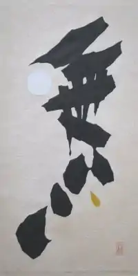 Two unique qualities of Maki Haku prints are the textures achieved by working the designs in wet cement and the use of Kanji (Chinese characters) as design motifs.[5] In 1962, he started adding texture to his prints. At first, he added texture to the entire sheet after it was printed. In 1965, he began embossing designs into unprinted paper by using a press to transfer a design created in cement on a carved plywood board, and then adding color with stencils.[6][7] He distorted and rearranged the strokes of Chinese characters to produce striking and serene images. For example, Poem 71-91 is a highly stylized representation of the kanji 無, which is pronounced mu and means nothingness, an important concept in some forms of Buddhism.