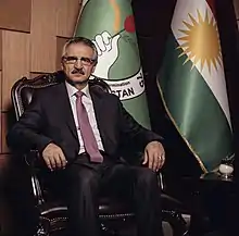 Hikmat Muhammad Karim (born 20 August 1954, Khanaqin),[1] known as Mala Bakhtiyar or Mala Bakhtiar (Kurdish: مهلا بهختیار ,Mela Baxtiyar),[2][3] is a political leader and a Senior Iraqi Kurdish politician.[4] He is a commander and General of the Kurdish PUK Peshmerga forces and is considered one of the most powerful people in Iraq.[5] Mala Bakhtiar is the former chief of the Executive Bureau of the Patriotic Union of Kurdistan.[6] He is now the Joint leader of the Supreme political council of the Patriotic Union of Kurdistan (PUK), alongside Kosrat Rasul Ali.[7] Mala Bakhtiar was awarded a medal for being the best national and intellectual figure of the middle east by the International Union of Economists and Managers in the European Union and was recognized as an international democratic figure in 2014.[8] His power is on the rise after the PUK held its 4th congress on 19 December 2019, during which he was elected into the Supreme Political Council of the PUK.[9] In November 2021, it was reported that he was being treated after being poisoned.[10] On 13 November 2021, after receiving treatment in Berlin, Germany, he returned to Sulaimaniyah, Kurdistan, where he received a Hero’s welcome.[11]