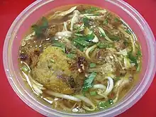 - Bihun belacan, rice vermicelli dressed in a gravy made from ground chillies, belacan, tamarind, and dried shrimp. It is garnished with cured cuttlefish, julienned cucumber, bean sprouts and century egg wedges.[29]