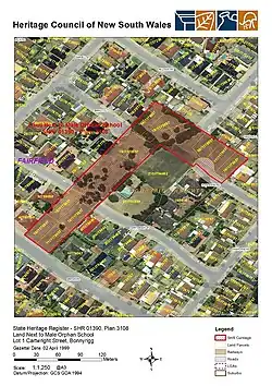 Site inspection, research and mapping of the site indicate that it formerly contained five discrete localities with potential to contain historic relics that would be disturbed by development. Two of these localities are located at the south west end of the site; the other three are situated near Homestead Rd. These are described below Proposed Stage 1 Development Area (Extension of Cartwright St and subdivision and sale of four residential allotments at the South of the SHR listed precinct) Feature 1 was once occupied by a long timber structure (approx. 35m by 3.5m), constructed by 1863, possibly after the transfer of the property into private hands, and which is of unidentified function. The structure is located along the eastern boundary of the proposed Lot 12. Feature 2 consists of the site once occupied by the Orphan School Dormitory Block. This was a brick structure, 4m x 17m on plan, currently located within the area of the proposed Cartwright St extension. It may extend slightly to the south into Lots 12 and 13. Proposed Stage 2 Development Area (Extension of Homestead Drive and subdivision and sale of six residential allotments to the north of the SHR listed precinct including the NE corner of Lot 210 included in the SHR listed precinct for Bonnyrigg House) Feature 3 consists of the former Male Orphan School Hospital site. This building was a timber structure, 4m x 17m on plan, with a centrally-located brick fireplace. It was enclosed by a timber fence. The indicative location of this site is within proposed allotments 15 and 16.[1]