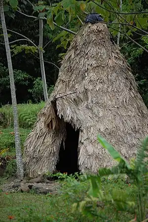 Maleku society was traditionally egalitarian, with little internal stratification, and featured gendered division of labor.[5] Their religion is polytheistic and oriented toward nature. Many aspects of Maleku culture are still practiced today, as seen in the production of traditional art for economic subsistence. Their culture is also shared with visitors through the tours they offer, which include cultural information like history, diet, and the reforestation program and ideology.[6] While the presence of Catholic missionaries was protective in the era of Spanish settlement, the terms of engagement did not remain economic and included the partial loss of cultural practices.[7] However, in 2016, linguist Carlos Sánchez Avendaño created dictionaries for three Costa Rican tribes including the Maleku in order to promote cultural retention among indigenous youth.[8] These dictionaries cover specific subjects like the wildlife prioritized by each tribe and recipes as well as the language as a whole and are meant to be publicly available as well. In addition, the work goes beyond translation to portray the cultural perspective, for example including bats and insects as flying animals in the Maleku animal dictionary.