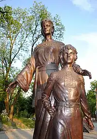 Malusha Malkovna[1][2] (Old East Slavic: Малушa) was allegedly a servant (kholopka) for Olga of Kiev and concubine of Sviatoslav I of Kiev. According to Slavonic chronicles, she was the mother of Vladimir the Great and sister of Dobrynya. The Norse sagas describe Vladimir's mother as a prophetess who lived to the age of 100 and was brought from her cave to the palace to predict the future. There are monuments of Malusha with her young son, Vladimir, in Korosten, Ukraine.