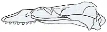 Mammalodon, with a length of 3 metres (9.8 ft), was smaller and more primitive than modern baleen whales.[6] Unlike other baleen whales, Mammalodon had a blunt and rounded snout. The left maxilla—upper jaw—of specimen NMV P199986 preserved four premolars and three molars, and the space between the teeth (diastema) increased towards back into the mouth. The molars decreased in size back into the mouth, like in archaeocetes, and the bottom jaw had two more molars than the upper jaw. The specimen's lower jaw indicates it had 24 lower teeth in all, all tightly spaced together. The upper teeth all looked the same (monodonty), whereas the bottom teeth varied in shape (polydonty) which is an ancient characteristic of whales. There were three lower incisor teeth, and one upper incisor with possibly two or three vestigial incisors. The teeth were likely never replaced, and the whale had the same set of teeth throughout its life. The single upper incisor was markedly smaller than the other teeth, and smaller than the upper incisors of Janjucetus. The cheek teeth—molars and premolars—were all double-rooted, and the lower molars were serrated and triangular.[1][7]