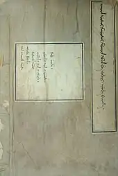 The Jiu Manzhou Dang, archives of early 17th century documents, contains the earliest use of Manchu.[8] However, the actual etymology of the ethnic name "Manju" is debatable.[9]:49 According to the Qing dynasty's official historical record, the Researches on Manchu Origins, the ethnic name came from Mañjuśrī.[10] The Qianlong Emperor also supported the point of view and even wrote several poems on the subject.[11]:6