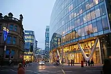 Aside from offices, Spinningfields was home to a number of high end retail units such as Armani and Mulberry. However, with the main retail district being on the opposite side of the city centre, these units struggled.[37] In recent years the district has cultivated a far more successful image in the food and drink offering with a number of popular restaurants and bars in the area. Footfall, particularly in the evening after work hours, has increased, and revenue from retail and leisure in Spinningfields has risen from £10 million in 2008 to £50 million in 2014.[38]