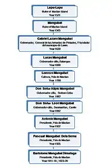 • Tomasa Mangubat – mother of Pascual dela Serna the last juez de paz of Lapu–Lapu and the first elected municipal president(mayor) of Lapu–Lapu City.[34][35] The visita chapel of Mactan Island where Sr. San Roque was enshrined is said to have been entrusted to the Mangubat family who founded the first town(Opon) in Mactan Island in year 1600s, up to the time when Tomasa Mangubat, a daughter of Alejandro Mangubat married the first Rito dela Serna in the 1800s.her descendants include the late former Governor of Cebu Vicente dela Serna, former Vice Governor of Cebu Agnes Magpale, mayor Mariano Dimataga, Mayor Ernest Weigel, and Mayor Arturo Radaza.