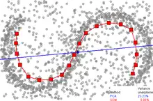Approximation of a principal curve by one-dimensional SOM (a broken line with red squares, 20 nodes). The first principal component is presented by a blue straight line. Data points are the small grey circles. For PCA, the Fraction of variance unexplained in this example is 23.23%, for SOM it is 6.86%.[5]