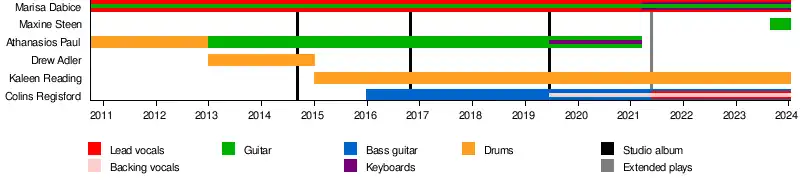 In October 2021, the band embarked on tour with two new touring members: guitarist and keyboardist Carolyn Haynes and guitarist Maxine Steen.[26] On Saturday, October 30 the band members awoke to find that someone had stolen their 2012 Econoline touring van with attached U-Haul trailer, containing over $50,000 worth of equipment. Their tour continued with borrowed equipment from other bands.[27]