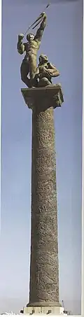 Carbonell was selected in a competition in 1992,[25] this was to create one of the largest bronze monuments in the State of Florida, the artwork for Miami's Brickell Avenue Bridge, Miami Florida.[26] Carbonell created the 53-foot bronze public monument "The Pillar of History and the Tequesta Family", located mid-span on the bridge. The pillar illustrates a carved graphical narration of the lives of the Tequesta Indians, Miami's first inhabitants, featuring 150 figures. At the top stands a 17-foot bronze sculpture, "Tequesta Family" portraying a Tequesta Indian warrior aiming an arrow to the sky with his wife and child at his side. In the niches at the supporting piers are four 4-foot by 8-foot bronze bas reliefs honoring the quintessential Miami pioneers Henry Flagler, Dana A. Dorsey, William and Mary Brickell, Marjory Stoneman Douglas and Julia Tuttle, depicting them in their historical perpetual settings. Twelve bronze bas-reliefs of Florida fauna are located at the base of the flagpoles on the walk ways of both sides of the bridge.[27]