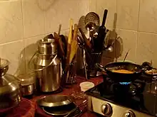 Milk is important as a staple food.[21] Both cow milk and water buffalo milk are popular. Milk is used mainly for drinking, to add to tea or coffee or to make homemade dahi (yogurt). Traditionally, yogurt is made every day using previous day's yogurt as the starting bacterial culture to ferment the milk. The Dahi is used as dressing for many salad or koshimbir dishes, to prepare Kadhi, to prepare cultured buttermilk (Taak) or as a side dish in a thali.[22] Buttermilk is used in a drink called mattha by mixing it with spices.[23] It may also be used in curry preparations.[24] Milk is also the prerequisite ingredient for butter and Ghee (clarified butter).