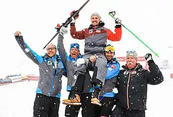 In December 2018 Hirscher became Austria's most prolific World Cup race winner when he won a slalom in Saalbach-Hinterglemm in his native state of Salzburg, his 63rd World Cup victory, taking him past the previous record holder Annemarie Moser-Pröll.[23] He took a total of 14 World Cup wins in 2018, breaking the previous record for most World Cup race wins in a single calendar year set by Ingemar Stenmark, but was eclipsed by Mikaela Shiffrin, who set a new record by winning 15 World Cup events during 2018.[24] He was named as a L'Équipe Champion of Champions for 2018, as well as Eurosport's Sportsman of the Year.[6]