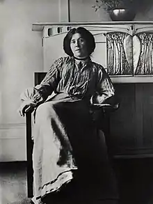 Mackintosh did not keep sketchbooks, which reflects her reliance on imagination rather than on nature.[19] A few sources provided significant inspiration for her works, including the Bible, the Odyssey, poems by Morris and Rossetti, and the works of Maurice Maeterlinck.[19] Her works, along with those works of her often collaborating sister, defied her contemporaries' conceptions of art. Gleeson White wrote, "With a delightfully innocent air these two sisters disclaim any attempt to acknowledge that Egyptian decoration has interested them specially. 'We have no basis.' Nor do they advance any theory."[19]