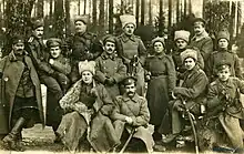 At the outbreak of World War I in 1914, Bochkareva left Buk and returned to Tomsk. In November, she was rejected by the 25th Tomsk Reserve Battalion of the Imperial Russian Army. The commander suggested that she try joining the Red Cross instead. When she insisted that she wanted to fight with the men, the commander helped her compose a telegram to Tsar Nicholas II requesting his personal permission.[3] When she obtained his approval, she underwent three months' training[4] and was sent to front-line duty with the 5th Corps, 28th Regiment of the Second Army, stationed at Polotsk. She was decorated for rescuing fifty wounded soldiers from the field.[1]