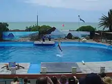 The history of Marineland began in 1964 when an Auckland architectural firm was commissioned by Napier City under mayor Peter Tait to design an aquarium and dolphin pool.[1] In late January 1965 Marineland caught its first common dolphin, Daphne, and the facility opened two days later. In 1969, two dolphins died when vandals broke in and fed them nails.