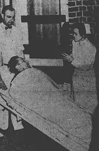 On May 30, 1936, Zioncheck's wife left him after an argument during a party at their apartment. On June 1, he became frantic and searched Washington, D.C. for her. He was arrested later that day on a lunacy warrant.[8] He was confined in Gallinger Municipal Hospital Psychopathic Ward, during which his wife returned to him.[9][10] Doctors blamed overwork and his hectic lifestyle.[11]