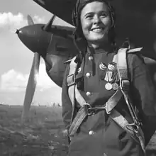 Mariya Ivanovna Dolina (Ukrainian: Марія Іванівна Доліна, Russian: Мария Ивановна Долина; 18 December 1922 – 3 March 2010) was a Pe-2 pilot and deputy squadron commander in the women's 125th “Marina M. Raskova” Borisov Guards Bomber Regiment. She was active primarily on the 1st Baltic Front during World War II. On 18 August 1945 she was awarded the title Hero of the Soviet Union.