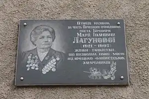 She was made an honorary citizen of the city of Brovary. In 2010, on the eve of the Victory Day celebrations in the city of Nizhny Tagil a memorial plaque was installed in her memory.[27][28]