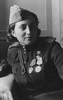 On 24 September 1943 she was one of the first 13 soldiers to reach the right bank of the Dnieper River, doing so under heavy enemy fire in the village of Grebeni in the Kyiv oblast. Throughout ten days of intense battle she rescued 112 injured soldiers from the battlefield, providing first aid and transporting them back across the river to a medical center. In the beginning of the offensive she operated a machine gun in battle. On 23 October 1943 she was awarded the title Hero of the Soviet Union by decree of the Presidium of the Supreme Soviet for her actions in the Dnieper battle.[1] After receiving the title she continued to serve on the frontlines until being recalled from the front in May 1944 to give a speech at the 3rd Youth Anti-Fascist Rally in Moscow. After speaking at the rally she was sent to study at the Kharkov Military Medical School, which had been relocated to Ashgabat, Turkmenistan due to the war; however, she did not graduate from the school.[3]