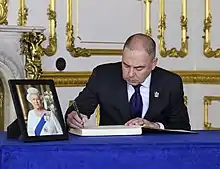 Brown signing the book of condolence for Queen Elizabeth II at Lancaster House on 17 September 2022