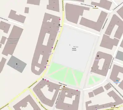 The square is rectangular in shape with one major street running through its western side, the Halych Street. Halych Street is one of the major transportation arteries of the city and is part of the H 09 (National Route 9). On the east edge stretches the Street of Sheremety which starts at Shpytalna Street (just northeast of the square) and connects the Market Square with Mickewicz Square. The southern edge was part of the September 17th Street, but after the fall of the Soviet Union the street was "annexed" to the Market Square.[1] The northern row of buildings was the only one that never changed its owner and stayed as part of the square even through the Soviet times. In the middle of the square is located Ratusha, the former city's town hall. Just south of the Ratusha is located a fountain in the form of an egg. The square is surrounded by rows of some commercial and residential houses of two-three stories high.