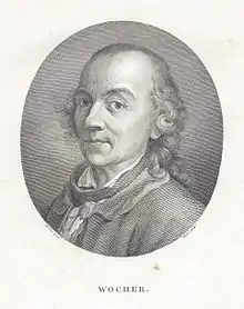Marquard Wocher was born on 7 September 1760 in the village Mimmenhausen near Salem, Germany as the son of the painter Tiberius Wocher.[1] His father settled to Bern, Marquard followed him soon[1] and was trained as a painter by him. For a short while he was employed at the workshop of the painter Johann Ludwig Aeberli, who introduced him to Johann Wolfgang von Goethe in 1779.[1] In 1782 he eventually installed himself in Basel.[1][2]