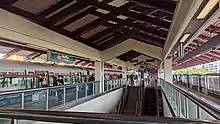 Following numerous incidents of commuters falling on the tracks and unauthorized intrusions, the Land Transport Authority made the decision in 2008 to install half-height platform screen doors (HHPSD) for all above-ground stations in phases.[2] HHPSDs started operation from 22 December 2011 with Admiralty.[3] This station was installed with high-volume low-speed fans, which commenced operations on 21 November 2012.