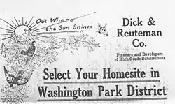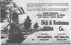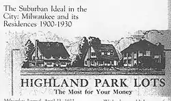 During the 1920s to 1950s, city boundaries at the time ended at 27th Street. The Town of Wauwatosa ran from what is now 27th Street to 124th Street. Ads began to run in the daily papers or on posted bills. An example of three ads from the period marketing property around Washington Park are pictured. The plotting of lots were completed and many houses were constructed during the period of 1920-1929. Sanborn maps were created and fire insurance risks were calculated for this region. Most homes were of frame construction. The subdivision developments of the Martin Drive neighborhood were the Park Front, Highland, Schmoldts, and Menomonee plats.